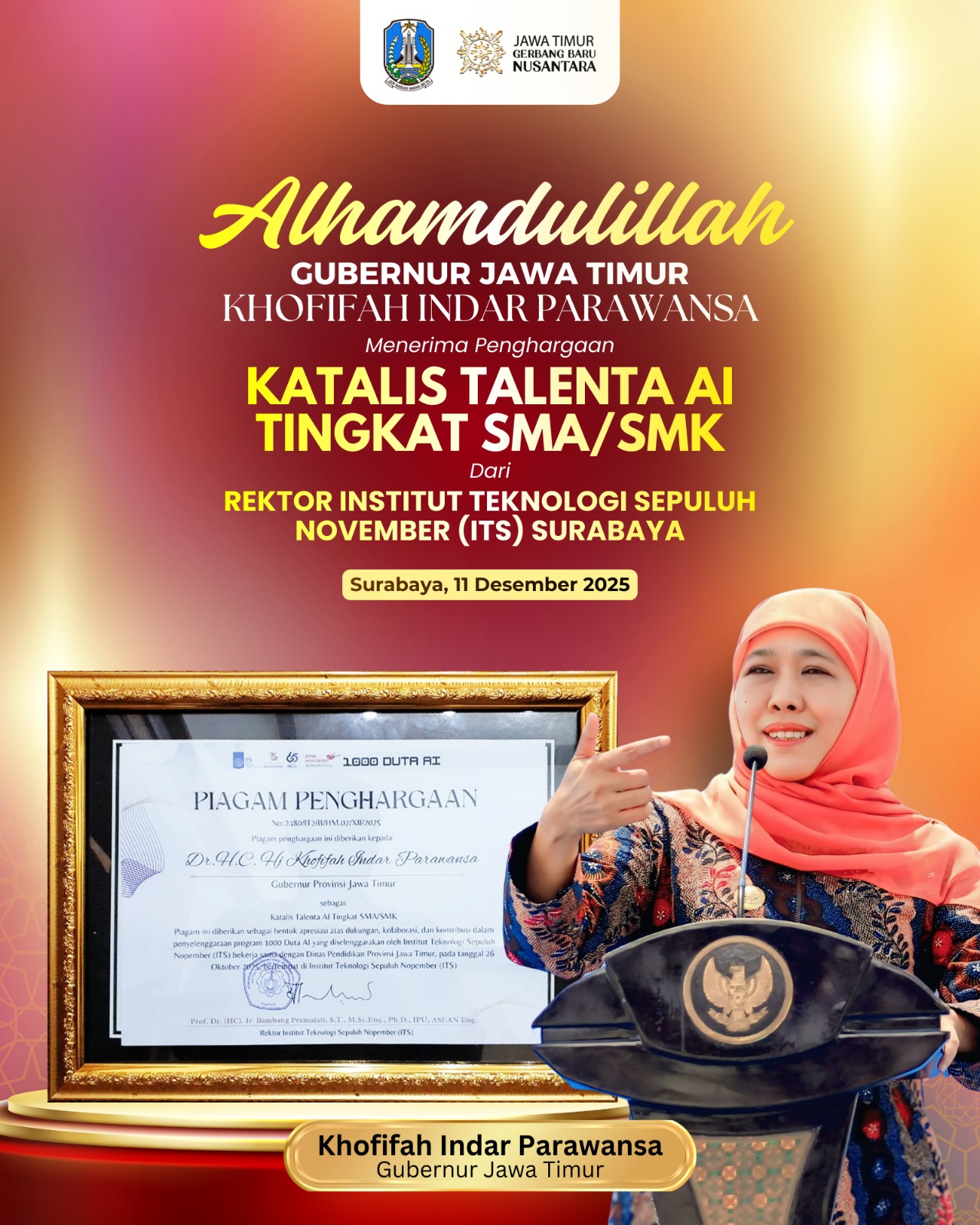KLIKJATIM.Com | Surabaya – Pemerintah Provinsi Jawa Timur kembali menerima penghargaan bergengsi di sektor pendidikan. Gubernur Jawa Timur, Khofifah Indar Parawansa, meraih penghargaan “Katalis Talenta AI SMA/SMK” dalam ajang Artificial Intelligent Talent and Innovation Day (ATID) 2025 yang diselenggarakan oleh Institut Teknologi Sepuluh Nopember (ITS) Surabaya.