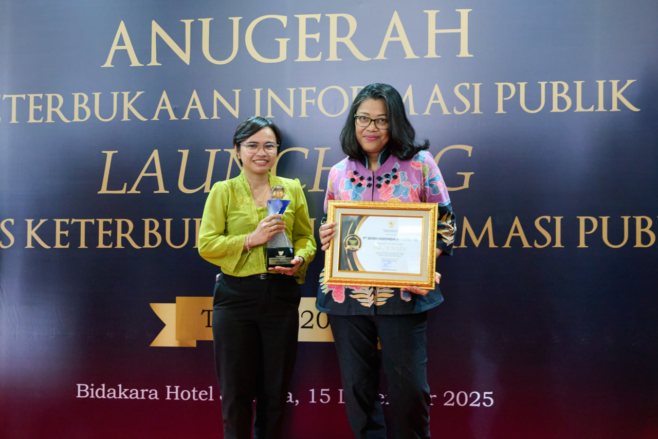Penghargaan tersebut diserahkan oleh Komisioner Bidang Advokasi, Sosialisasi, dan Edukasi KIP, Samrotunnajah Ismail, kepada Senior Manager of External Communication SIG, Novi Maryanti, pada acara Anugerah Keterbukaan Informasi Publik dan Peluncuran Indeks Keterbukaan Informasi Publik Tahun 2025 yang digelar di Hotel Bidakara, Jakarta, Senin (15/12/2025).