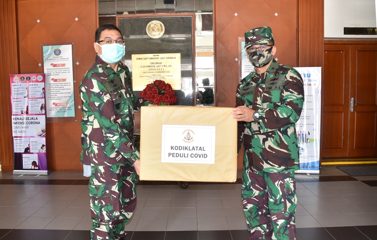 KLIKJATIM.Com | Surabaya - Komando Pembinaan Doktrin Pendidikan dan Latihan Angkatan Laut (Kodiklatal) menyerahkan bantuan Alat Pelindung Diri (APD) ke Rumah Sakit TNI AL (RSAL) dr Ramelan Surabaya, Selasa (5/5/2020).
