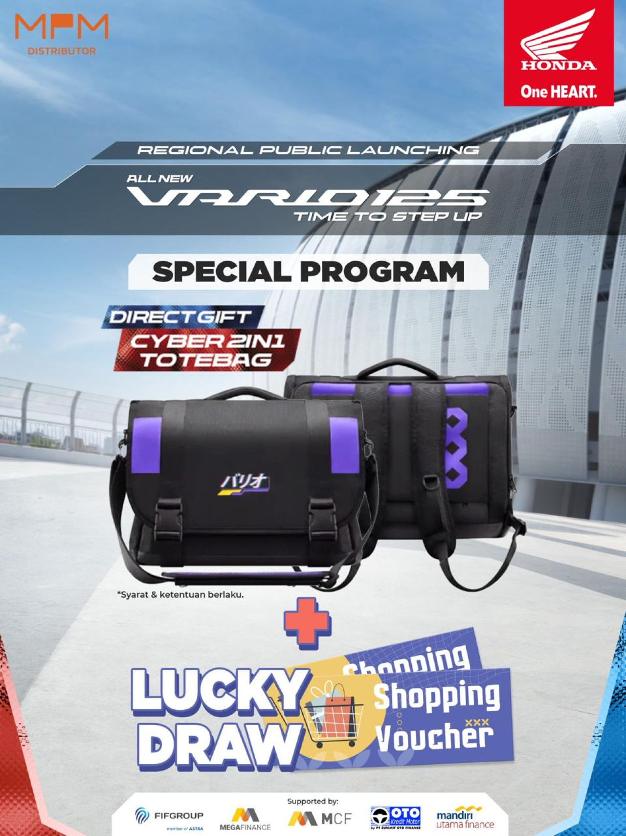 Sebagai bentuk apresiasi kepada konsumen, MPM Honda Jatim turut menghadirkan program spesial pembelian selama acara berlangsung. Konsumen yang melakukan pembelian All New Honda Vario 125 berkesempatan mendapatkan direct gift Cyber 2in1 Totebag serta mengikuti Lucky Draw Shopping Voucher, dengan syarat dan ketentuan berlaku.