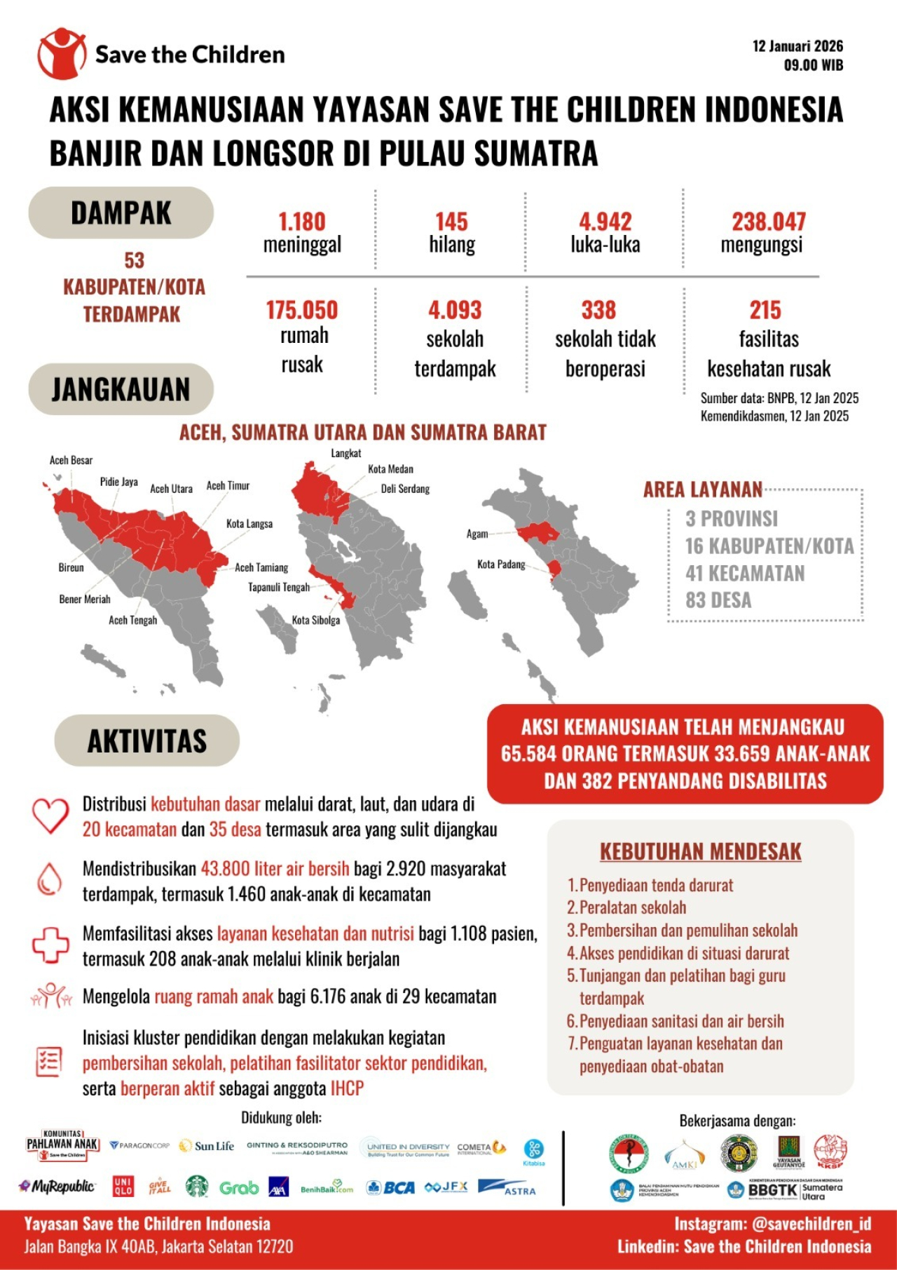 Kajian bersama Save the Children dan Humanitarian Forum Indonesia pada Desember 2025 turut menyoroti kondisi di sejumlah lokasi pengungsian. Ketersediaan air bersih masih terbatas, banyak fasilitas kesehatan terdampak dan tidak berfungsi optimal, sementara kebutuhan dasar balita, ibu hamil, dan ibu menyusui belum terpenuhi secara layak.