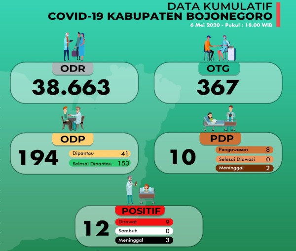 Sehingga jumlah pasien positif covid-19 di Kabupaten Bojonegoro masih tetap 12 kasus. Dengan rincian sembilan orang masih dalam perawatan, dan tiga orang telah meninggal dunia.