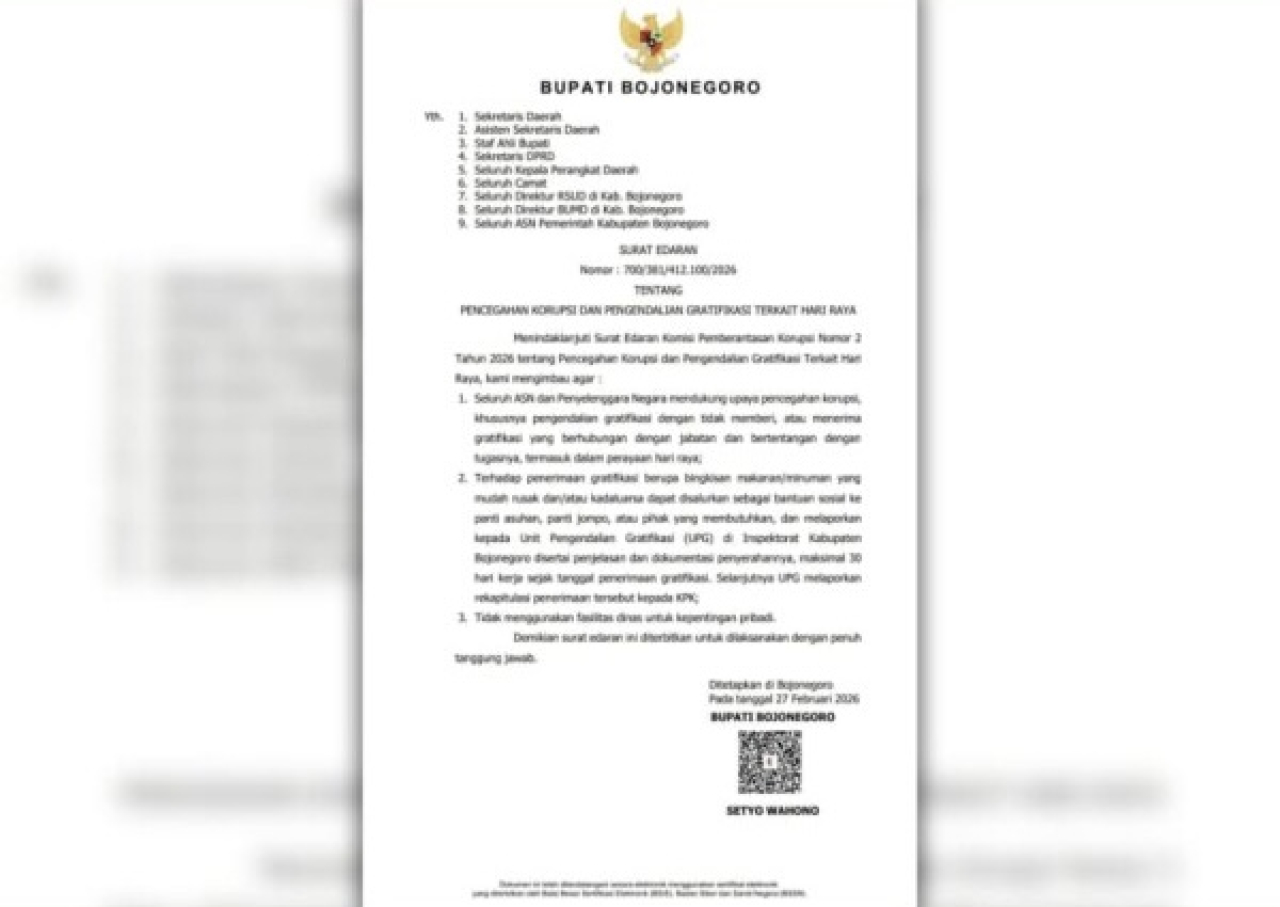 Bupati Bojonegoro, Setyo Wahono, menerbitkan Surat Edaran (SE) Nomor: 700/381/412.100/2026 tentang Pencegahan Korupsi dan Pengendalian Gratifikasi Terkait Hari Raya. Kebijakan tersebut merupakan tindak lanjut dari Surat Edaran Komisi Pemberantasan Korupsi (KPK) RI Nomor 2 Tahun 2026.