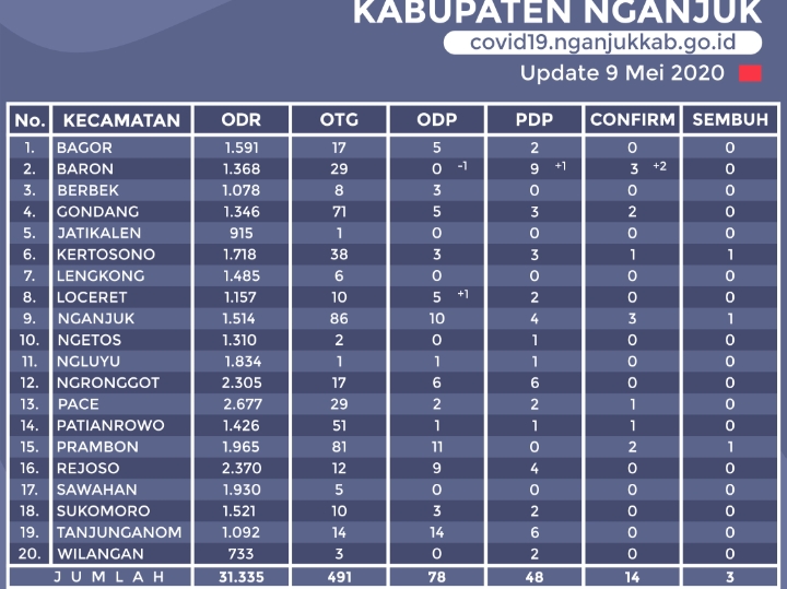 KLIKJATIM.Com | Nganjuk - Jumlah penderita virus corona atau Covid-19 di Kabupaten Nganjuk terus bertambah. Per tanggal 9 Mei 2020, ada penambahan 2 orang lagi terkonfirmasi positif corona sehingga totalnya menjadi 14 kasus.