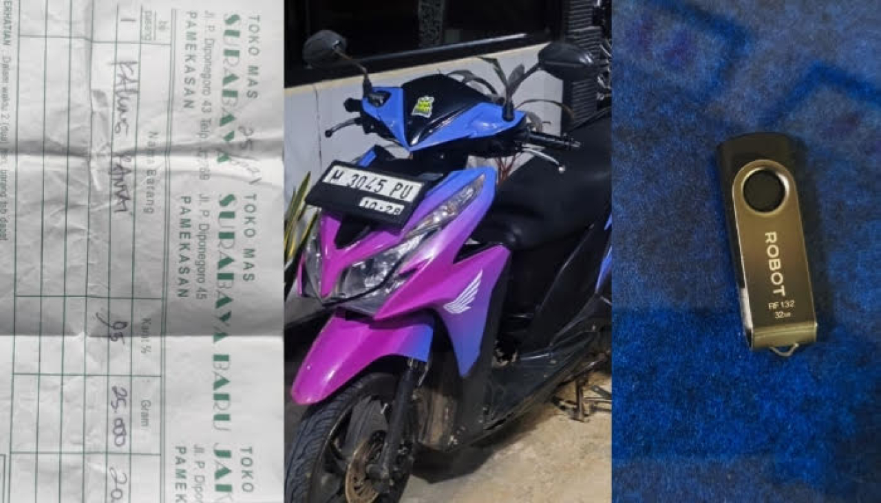 Selain mengamankan tersangka, petugas turut menyita sejumlah barang bukti berupa nota pembelian emas, rekaman CCTV yang disimpan dalam flashdisk, serta satu unit sepeda motor yang dipakai saat menjalankan aksinya.