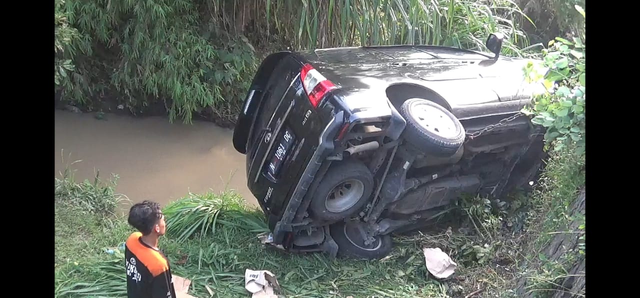 KLIKJATIM.Com | Nganjuk--Mobil Innova N 1061 DC yang dikendarai Suntoro Amerto Prasto (25) warga Sudimoroharjo, Kecamatan Wilangan, Kabupaten Nganjuk terjun ke sungai di Jalan Raya Surabaya-Madiun Desa Mancon, Kecamatan Wilangan, Nganjuk. Diduga Kecelakaan tunggal itu akibat sopir mengantuk.