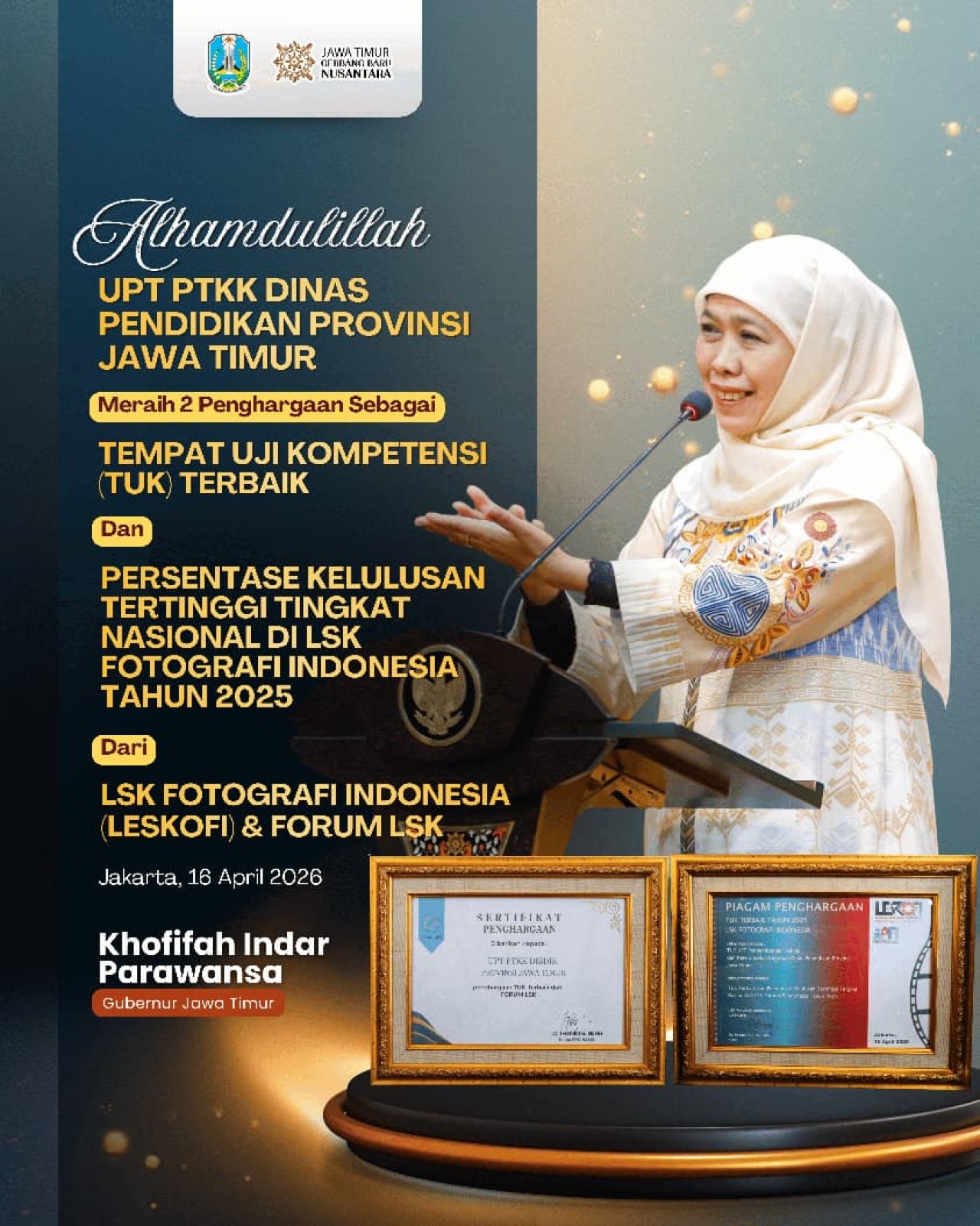 Gubernur Khofifah menyampaikan apresiasi tinggi atas prestasi ini sebagai bukti nyata konsistensi kualitas pembinaan vokasi di Jawa Timur.