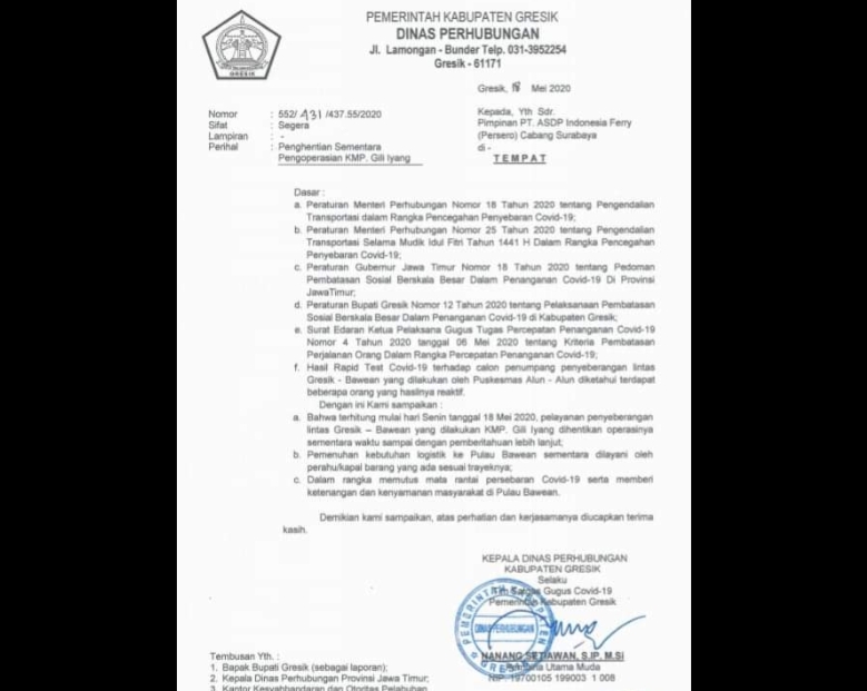 Kepala Dishub Gresik, Nanang Setiawan menambahkan, keputusan pemberhentian pelayaran ke Pulau Bawean merupakan permintaan Tim Satgas Pencegahan dan Penanganan Covid-19 Kabupaten Gresik.
