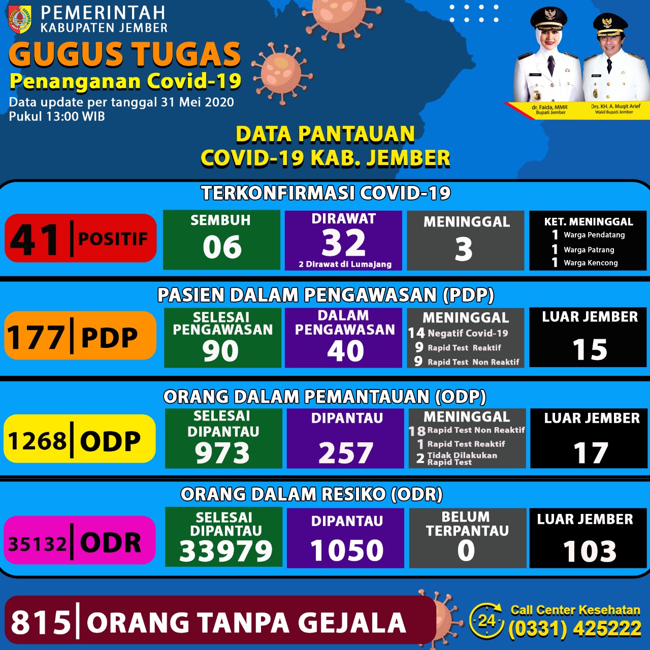 KLIKJATIM.Com | Jember – Jumlah kasus terkonfirmasi positif coronavirus disease (Covid-19) di Kabupaten Jember terus saja naik. Berdasarkan update data per tanggal 31 Mei 2020 terdapat penambahan 8 orang positif Covid-19, sehingga totalnya sampai saat ini menjadi 41 kasus.