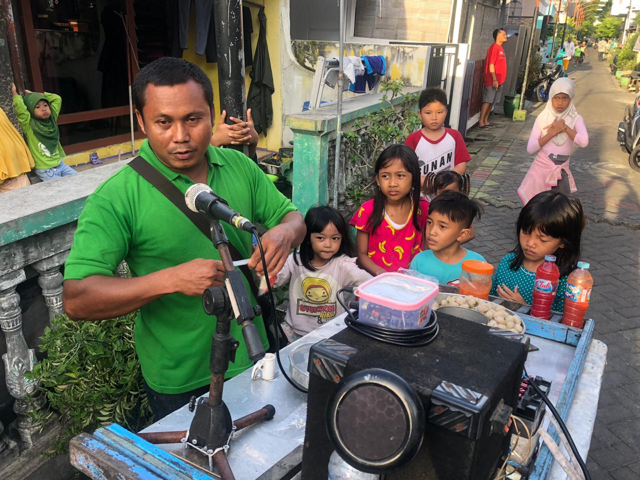 “Ini sudah jadi ciri khas. Kalau ada musik keras orang sudah tahu bahwa saya yang melintas. Kadang pembeli saya panggil dengan menggunakan sound yang terpasang di rombong,” jelas Soleh yang tinggal di Desa Karangturi, Gresik.