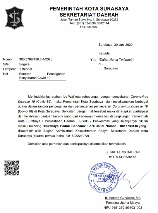 Surat tersebut ditanda tangani Sekretaris Daerah Kota Surabaya Hendro Gunawan No 360/5769/436.3.4/2020. Disebutkan juga dalam surat tersebut sebagai tindaklanjut dari arahan Wali Kota Surabaya Tri Rismaharini.
