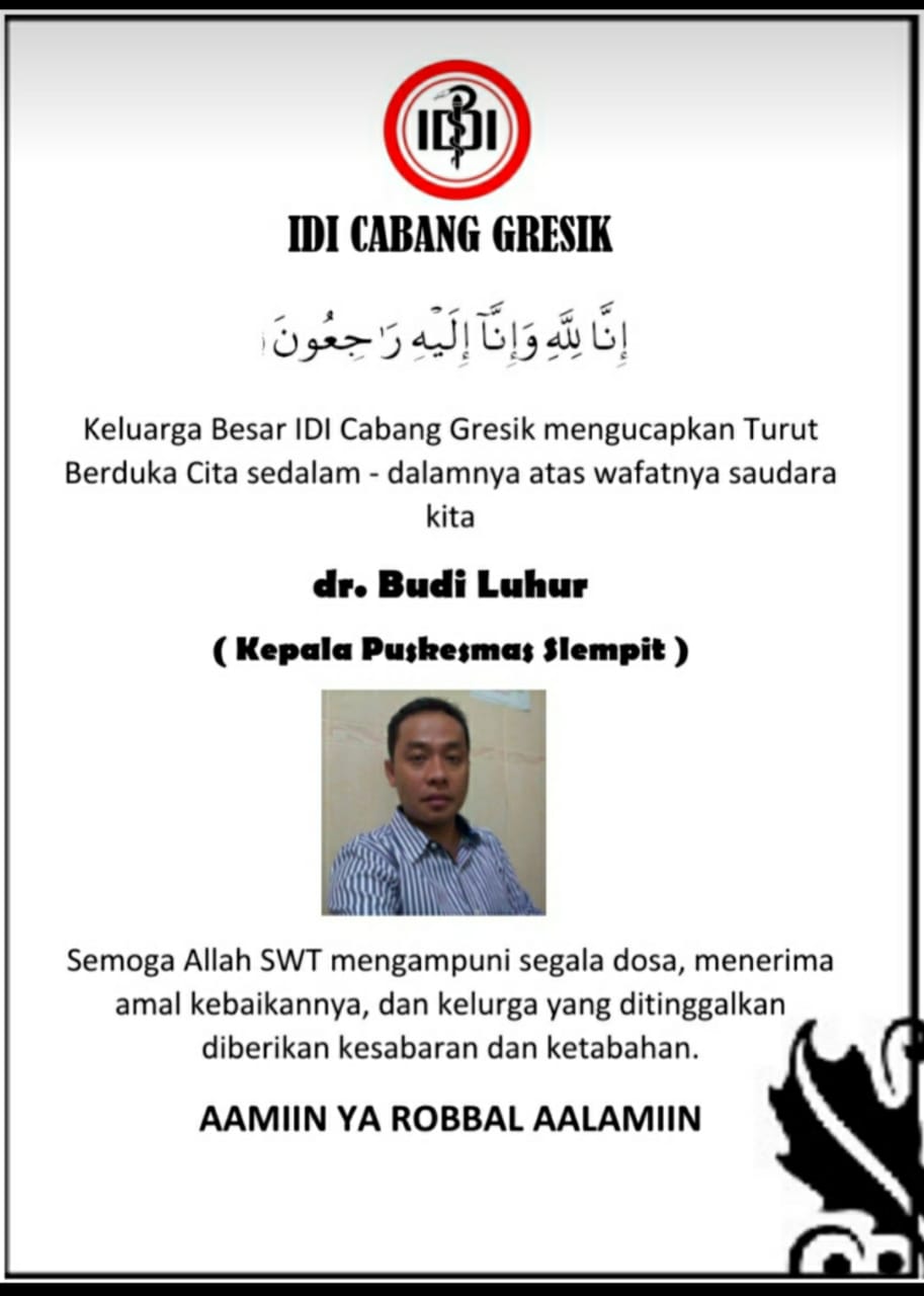 Setyo mengaku hasil swab dr Budi Luhur sudah keluar. Korban dinyatakan konfirmasi positif. Saat ini di Gresik sudah ada dua nakes yang meninggal karena covid-19. Pertama Bambang pegawai Dinkes berprofesi sebagai perawat gigi. Kemudian dr Budi Luhur Kepala Puskesmas Slempit. Yang bersangkutan merupakan mantan Kepala Puskesmas Dapet, Balongpanggang. Selain itu tenaga non medis yakni staf Dinkes juga sudah ada yang meninggal karena covid. Di Dinkes sudah dua orang meninggal.