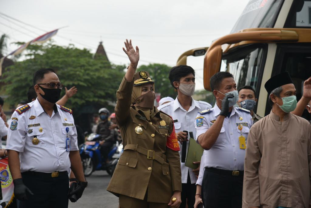 KLIKJATIM.Com | Jember –Bupati Jember, dr. Faida, MMR, bersama Dandim 0824, Letkol Inf. La Ode M Nurdin, dan Kapolres Jember, AKBP Aris Supriyono, di Terminal Arjasa Jember melepas keberangkatan santri Ponpes Salafiyah Syafi’iyah Sukerojo Situbondo (PSSSS), Rabu (15/7/2020).