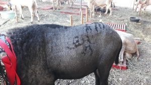 Selain domba bertanduk empat, ada juga domba yang diyakini di tubuhnya ada tulisan ‘Allah’ juga dijual. Domba ini kulitnya berwarna hitam. Harganya sama, Rp 12 juta.