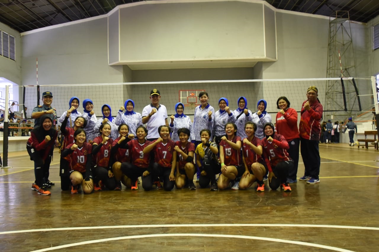 KLIKJATIM.Com I Surabaya - Tim Bola Voli Putri Komando Pembinaan Doktrin pendidikan dan Latihan Angkatan laut (Kodiklatal) keluar sebagai jawara Pekan Olahraga TNI AL Wilayah Timur (Porwiltim) tahun 2019 di GOR Jala Krida Braja, Bumimoro, Kodiklatal, Surabaya, Senin (22/7/2019). Pada pertandingan final yang disaksikan langsung Ketua Pengurus Gabungan (PG) Jalasenastri Kodiklatal Ny. Anti Dedy Yulianto tersebut, Tim Bola Volli Kodiklatal berhasil mengalahkan Tim Bola Voli Putri Koarmada II dengan skor 3 – 1 (25 – 23, 21 – 25, 25 – 16 dan 25-4).