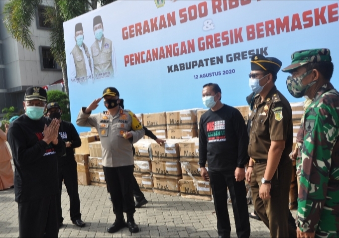 Pantauan di lapangan dalam kesempatan ini, Bupati Gresik membagikan masker kepada perwakilan masyarakat secara simbolis. Ketua Tim Penggerak PKK Kabupaten Gresik, Maria Ulfa Sambari juga menyerahkan sekotak besar berisi masker kepada Ketua GOW Gresik, Zumrotus Sholihah Qosim. Kemudian beberapa kotak lagi diserahkan kepada Ketua Bhayangkari Gresik, Persit Kartika Candrakirana Gresik, Ketua Dharma Wanita Gresik, serta perwakilan ibu-ibu yang lain.