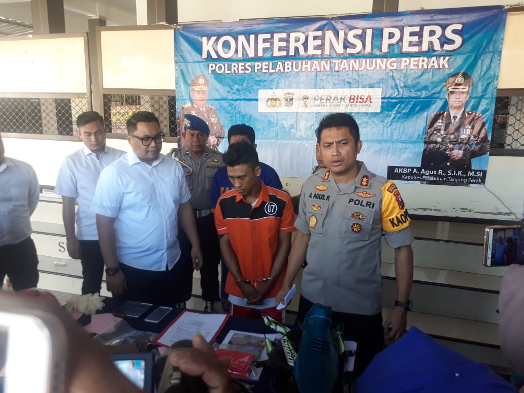 [irp]Kapolres Pelabuhan Tanjung Perak Surabaya, AKBP Antonius Agus Rahmanto membenarkan penangkapan tersebut.dari hasil pengembangan, dan juga hasil interogasi pelaku ini bersama rekannya (DPO) telah melakukan aksi penjambretan sebanyak kurang lebih 14 kali. Belasan tempat tersebut diantaranya, sekitaran Jalan Perak Barat-Timur, Kalianak, Margomulyo, Demak, dan Jalan Tanjung Sadari. “Iya benar, satu pelaku jambret sadis itu sudah ditangkap, sesuai janji kita yakni akan mengungkap kasus yang meresahkan tersebut,” ujar Agus Rahmanto, Senin (29/7/2019).