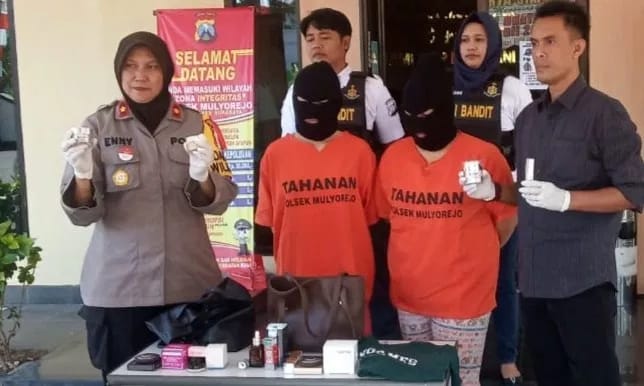 Kapolsek Mulyorejo Kompol Enny, kiri, menunjukkan barang bukti dan kedua pelaku menggunakan kerpus
