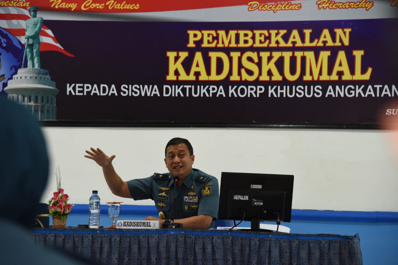 KLIKJATIM.Com I Surabaya - Prajurit korps Khusus merupakan pejuang sapta marga yang memiliki tingkat kesehatan dan kesamaptaan yang baik. Digembleng sebagai perwira profesional ini hingga memiliki dan menguasai serta memahami ilmu pengetahuan sesuai ilmu yang dimiliki. Demikian dikatakan Kepala Dinas Hukum TNI Angkatan Laut (Kadiskumal) Laksma TNI Kresno Buntoro dihadapan siswa Pendidikan Pembentukan Perwira (Diktukpa) TNI Angkatan Llaut Angkatan ke-48 Korps Khusus di Aula Pusdiklek Kesatrian Bumimoro Kodiklatal Surabaya, Kamis (1/8/2019).