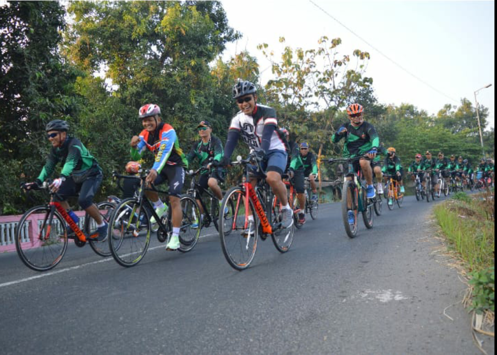 KLIKJATIM.Com | Lamongan - Momentum HUT Kemerdekaan ke 74 sekaligus HUT MaKorem 082/CPYJ ke 71, diperingati TNI dengan gowes bareng masyarakat yang tergabung dalam Lodeh Cycling Club (LCC) Indonesia, sabtu (10/8/2019). Ratusan peserta nampak semangat memeriahkan acara yang start, dari Makorem setempat hingga finish di pendopo Lokatantra Pemkab Lamongan.