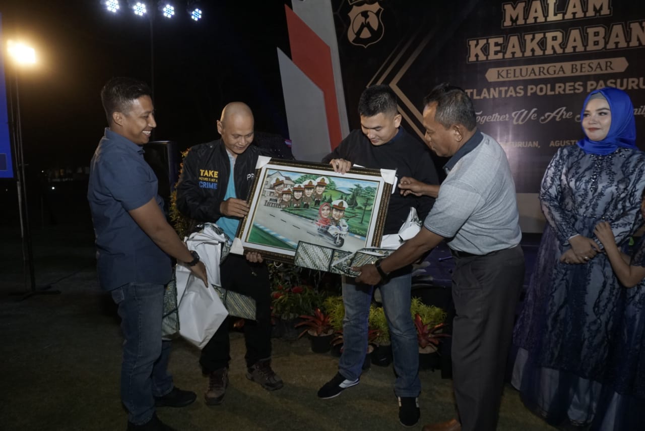 [irp]Pada akhir sambutan keduanya, dilanjutkan pemberian cinderamata dari masing-masing unit yang ada. Tak ketinggalan media Klikjatim.com yang selama ini mensupport pemberitaan kegiatan Satlantas Polres Pasuruan, memberikan cinderamata berupa karikatur bergambar AKP Eko beserta istri dan AKP Bayu serta perwira lantas lainnya. (hen/rtn)