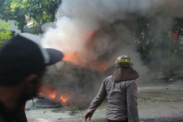 KLIKJATIM.Com | Malang - Unjukrasa penolakan pengesahan UU Omnimbus Law di Kota Malang berlangsung ricuh dan diwarnai aksi pembakaran, Kamis (8/10/2020). Itu terjadi setelah massa pengunjukrasa marah usai ditembak gas air mata. Mereka membalas tindakan aparat keamanan itu dengan membakar mobil Satpol PP.