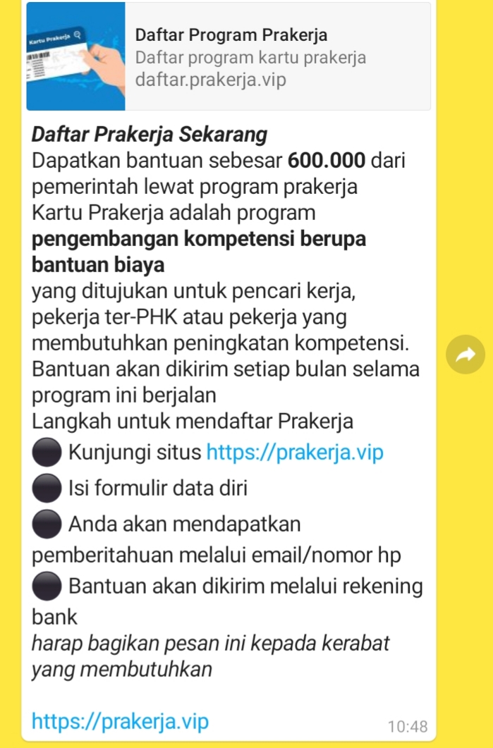 Narasi dari pengumuman berantai prakerja.vip yang terdapat di media sosial whatsapp berisi sebagai berikut :
