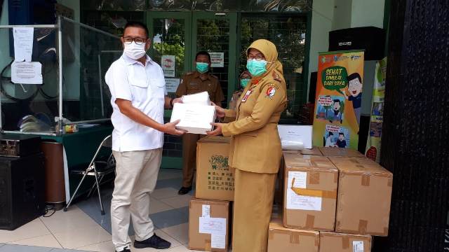 Penyerahan peralatan swab kit oleh Wihadi Wiyanto diterima langsung kepala Dinkes, Ani Pudjiningrum didampingi Sekretaris Dinas Kesehatan (Dinkes) Kabupaten Bojonegoro, Suharto dan Kepala Bidang Pengendalian Penyakit Dinkes Bojonegoro, dr Wheny Dyah.
