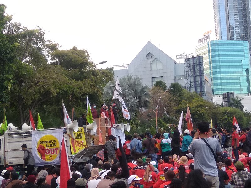 Mereka menuntut Gubernur Jatim bersama warga menuntut agar UU Omnibus Law Cipta Kerja dicabut. Massa gabungan dari buruh, mahasiswa dan warga ini tiba di lokasi aksi sekitar pukul 16.00 WIB.